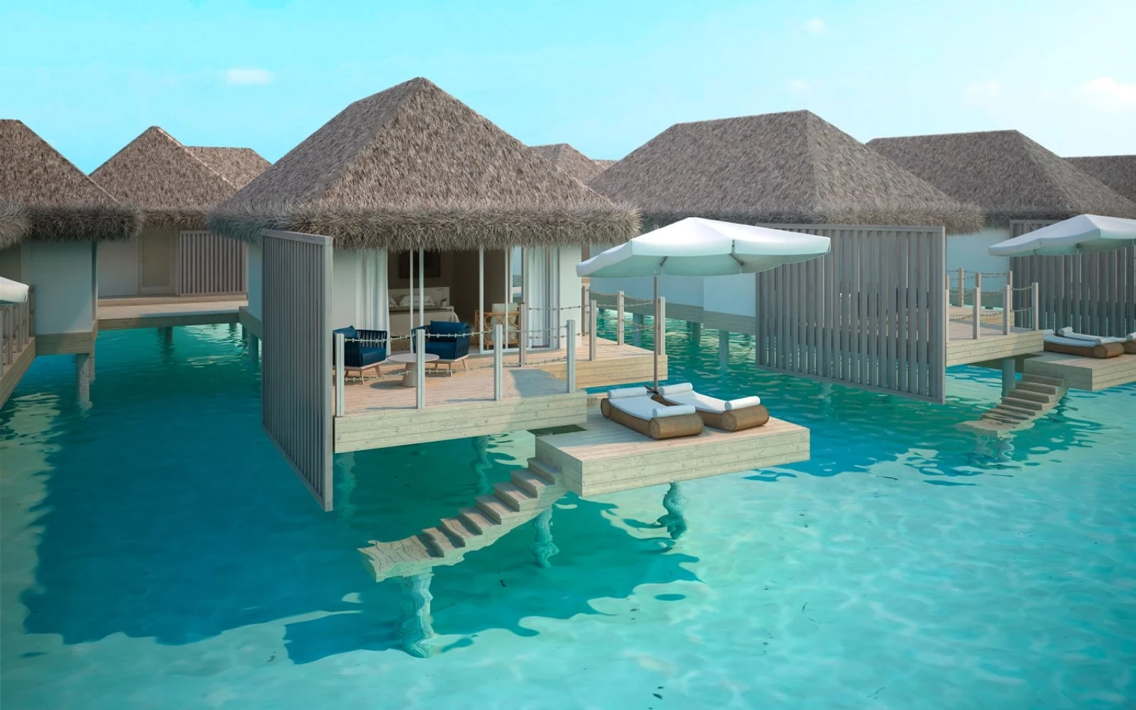- Water Villa: 105 mq, su palafitte sospese sull’acqua, con terrazza privata